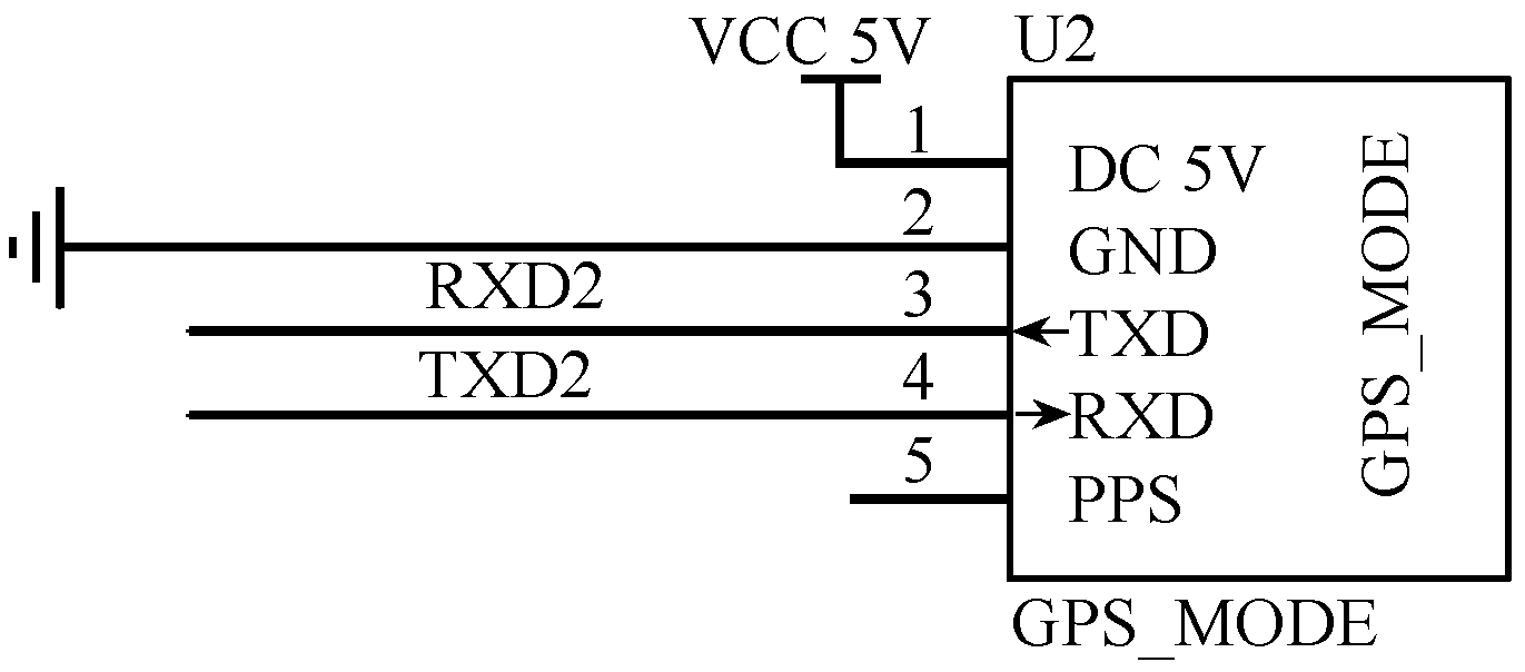 GPS-OME模块与主芯片间使用NEMA协议,时间及定位信息采用ASCII码传递。GPS与单片机连接方式如图5所示。其与主芯片通过引脚3连接单片机RXD引脚,引脚4连接单片机TXD引脚。