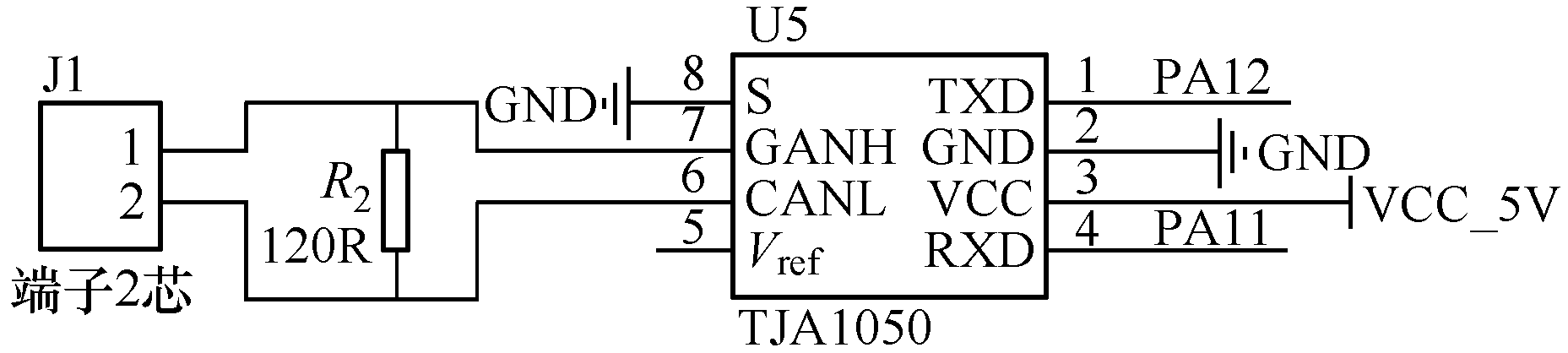 该系统使用TJA1050芯片运用CAN2.0B协议完成CAN总线高速收发,芯片内部集成了隔离及保护器件,将120Ω的电阻接在总线两侧,主要目的是提高传输过程中的耐扰性与可靠性,同时对各个节点的拓扑能力也有一定的提升。在硬件电路连接中,TXD引脚和RXD引脚负责接收和发送数据连接单片机的PA12与PA11,CAN总线与单片机连接方式如图6所示。