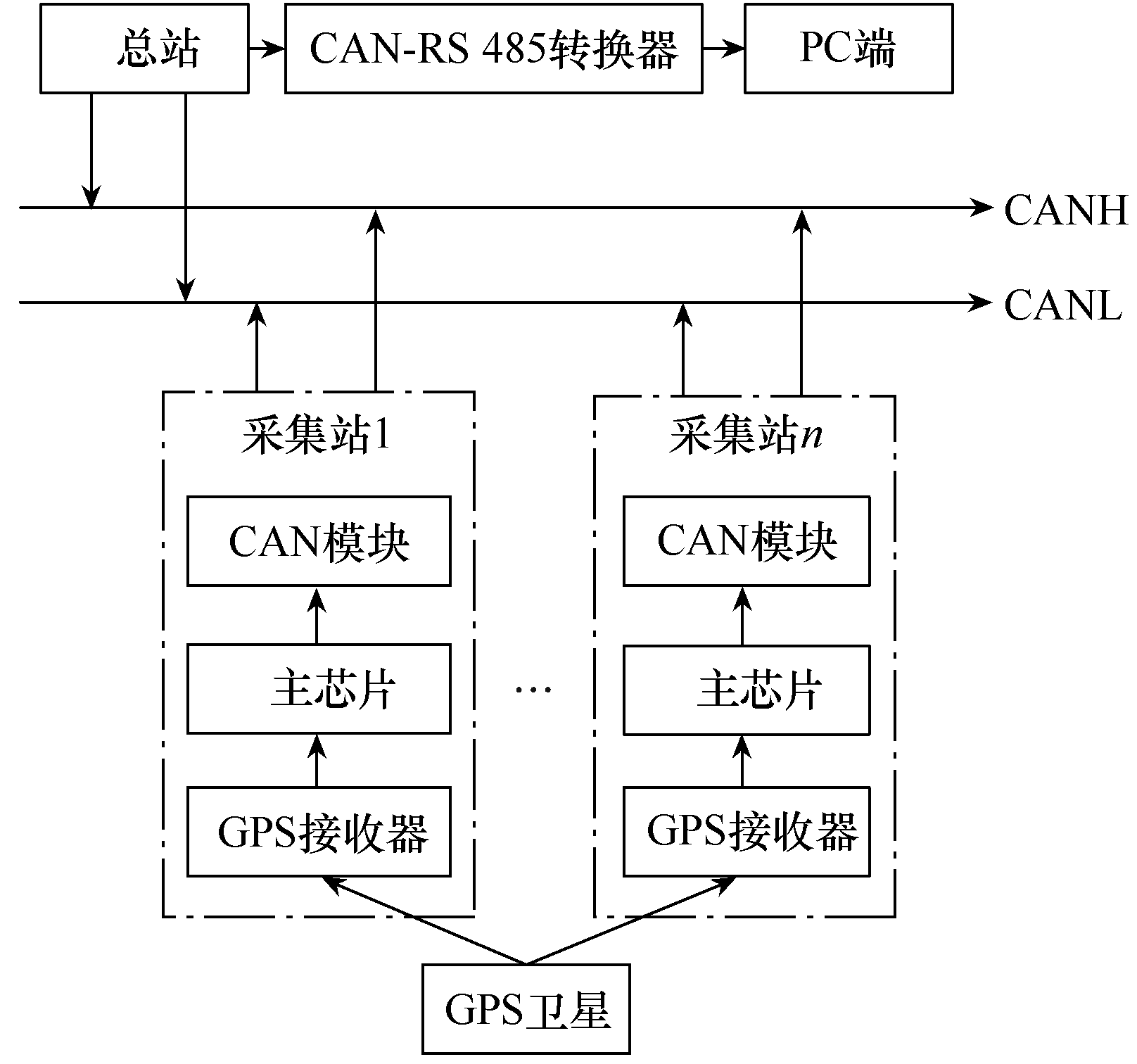CANH、CANL为CAN模块的传输线,沿皮带输送机全线架设,采集站间隔一定距离分布在皮带输送机沿线上,各个采集站连接在CANH、CANL上;总站设置在控制室,接收来自CAN总线所传输的定位信息,通过RS 485总线实现与PC端通信。