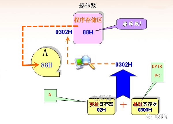 MOVC A,@DPTR+A;把DPTR和A相加作为新的16位地址0302H,根据这个地址得到程序存储器内的内容(操作数)88H送回累加器A中。