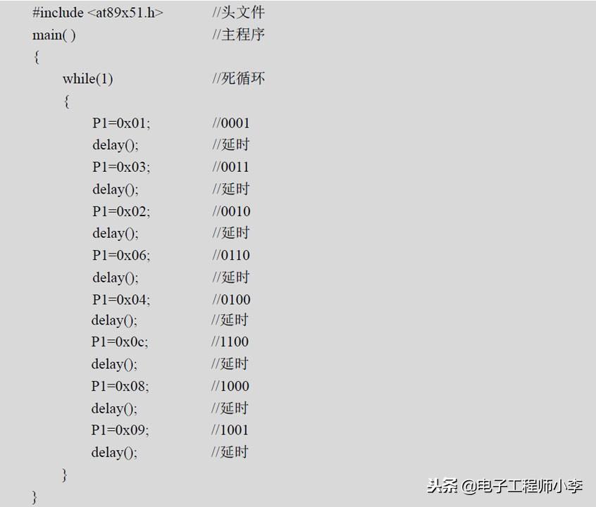 程序首先将 P1.0 清零以启动步进电机(A1),此状态保持 65ms,然后设置 P1.0 为1以停用电机的第 1 相。然后对 P1.1 到 P1.3 重复相同的过程,并一遍又一遍地重复整个循环,使电机沿顺时针方向旋转。