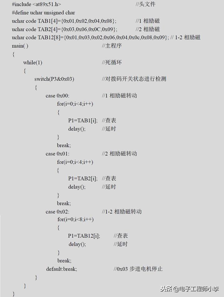 由于三种励磁状态每拍的状态均为已知,在软件设计中,可以将这些状态预先存储到3个数组当中,根据2组开关的状态去查询对应的数组即可实现步进电机励磁方式的切换。
