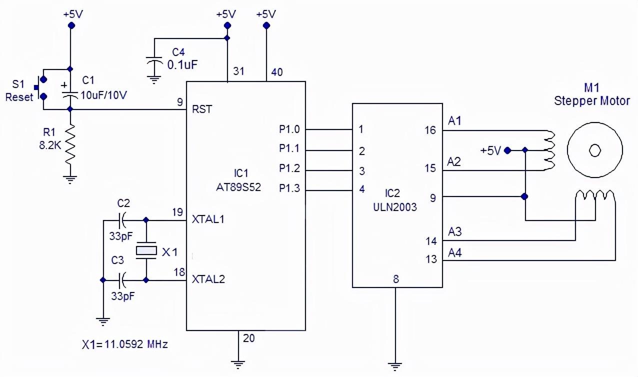 将步进电机按照电路图连接到 8051 的P1.0、P1.1、P1.2 和 P1.3 引脚分别用于控制步进电机的 A1、A2、A3 和 A4 相。ULN2003 用于驱动步进电机的各个相位。