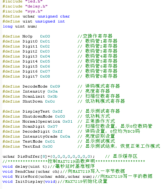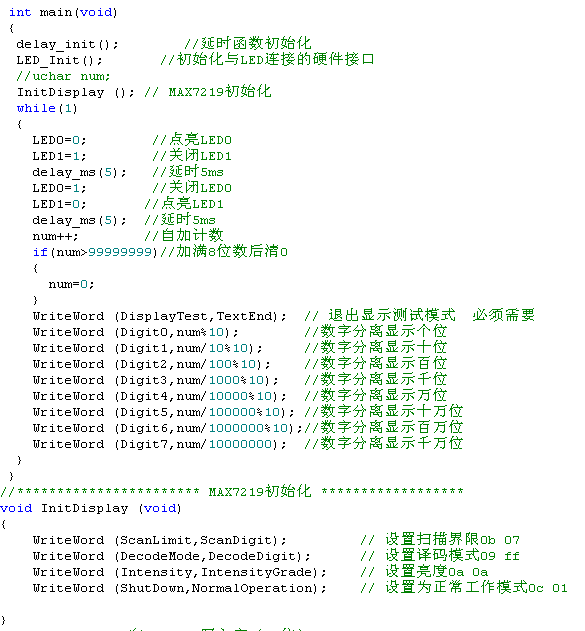 设需要的显示数字为num,num为长字节的无符号整型变量,在程序里设定num每10ms自加一次,即每10ms计数一次,然后通过数码管显示出来,注意num的计数满了之后需要清0。因为计数间隔设定是10ms,所以程序里的2个延时是5ms。