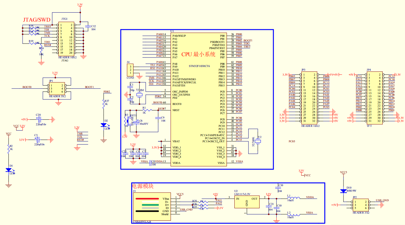 最小系统板的硬件原理图也比较简单,USB5V输入,经过开关后通过3.3V的LDO稳压供给单片机,有LED1作为上电指示,LED2连接STM32的IO口PD2,外加一些排针引出所有的GPIO口,原理图如下: