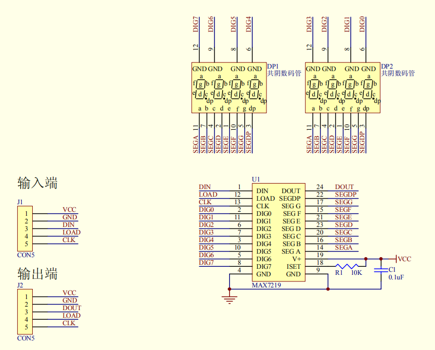 下面是数码管模块的原理图,用MAX7219驱动数码管。MAX7219是串行接口 8 位 LED 显示驱动器,接口与SPI兼容,并且亮度可通过R1的大小调节,使用起来也比较方便。