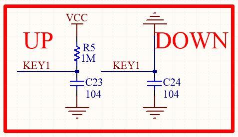 首先,我们来看一下按键和单片机的线路连接图(图1),KEY1直接连接到单片机IO口,单片机IO口设置为上拉输入状态,注意如果IO口内部无上拉电阻,那么还需外部增加上拉电阻,这一点在设计单片机线路时需要特别注意,不然将会拖慢项目进度。我们先来分析一下单片机是如何识别按键按下的,如下图所示,当按键未按下时,单片机IO口和地不相连接,因为我们设置了内部上拉,所以现在读取该IO口状态为高电平,也就是逻辑1,当按键按下时,单片机IO和地相连接,那么此时读取该IO口状态为低电平,也就是逻辑0,按键按下和未按下的等效示意图如图(2)。所以当我们读取IO口状态为“1”时,代表按键未按下,当我们读取IO口状态为“0”时,代表按键按下。
