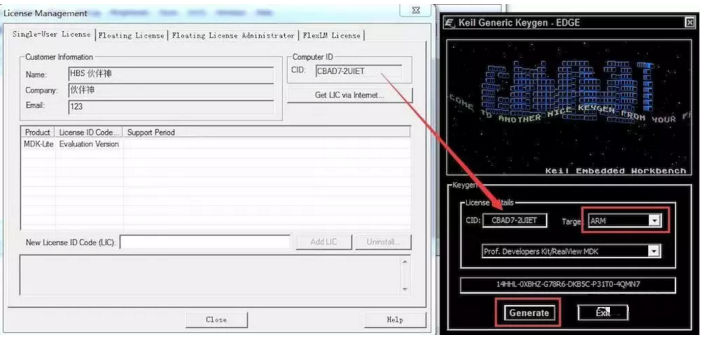13.将软件CID复制到注册机CID框内,选择ARM,点击Generate得到许可