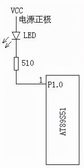 好了,现在我们将小灯接在单片机的P1.0端口上,如下图所示: