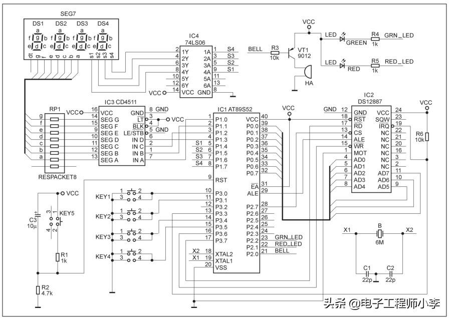 电路图中的4个按键功能分配如下,KEY1:数值加1键;KEY2:数值减1键;KEY3:调节项目选择,当该键按下可以选择不同的调节项目,依次为时钟的时、时钟的分、月份、日期、年、星期、闹钟的时和闹钟的分。KEY4:选择显示时间(包括时、分、月、日、年和星期)或闹钟。
