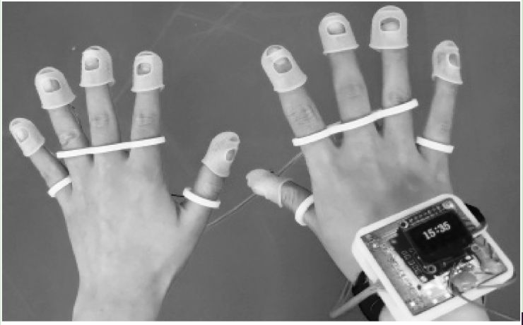 ①将从主控板上引出的两排主控信号线使用软排线进行连接,并且采用即拔即插的方式,方便用户配戴;②根据设计模型,从软排线的另一端将信号线分别引到双手的每根手指,与手指端传感器进行连接,通过指尖按压将信号传输至主控板;③对主板手表模型进行3D模型设计与搭建,此模型可按需求进行个性化设计。3.2 作品