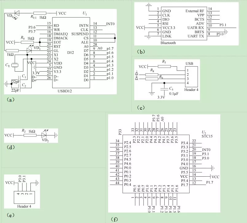 USB接收电路如图2所示。STC15单片机与USBD12芯片、蓝牙模块相连。作为核心控制芯片,USBD12是单片机与电脑通信的桥梁,负责把电脑发送的USB协议数据转发给STC15,并将STC15的应答数据转发给电脑。蓝牙模块负责接收主控板的用户动作数据,STC15将其处理后通过USBD12控制电脑的鼠标光标和键盘。