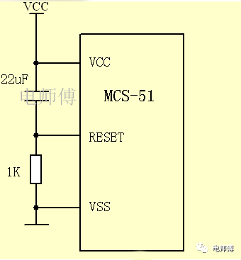 电路通电瞬间对电解电容充电,由于电解电容上的电压不能突变,相当于瞬间短路,也就是5V高电平通到单片机复位脚 上,电容在慢慢充电过程(RC乘积时间),复位脚上的电压会慢慢降低。只要复位脚上的高电平时间保持在2微秒(2us)就能可靠地复位(外部时钟为12MHZ时).。