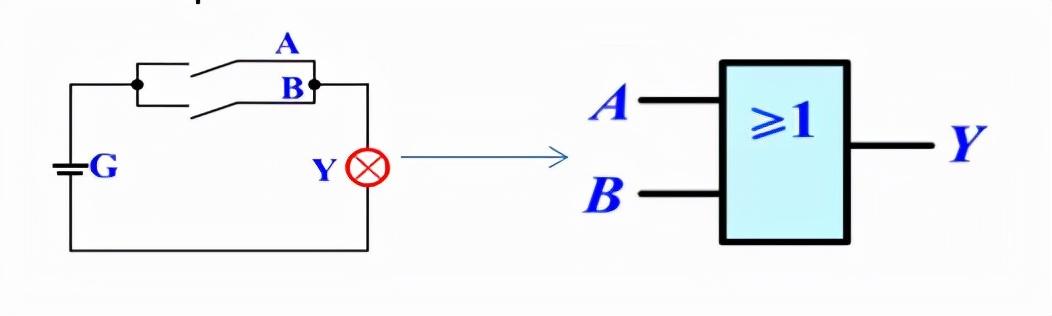 两个并联开关A、B同时控制一个小灯泡。“或”逻辑,当条件有一个以上为“真”时,逻辑结论就为“真”。也就是说当有至少一个开关闭合时,灯泡就被点亮。开关闭合是条件,灯泡被点亮是结果,这就是一个“或”逻辑关系。
