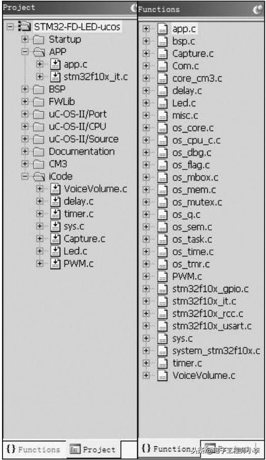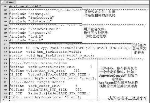 重要部分在app.c文件中,此文件有启动操作系统的main函数,各个任务的建立及运行函数,如图2.10所示。在我们自己编写的所有代码中,有5个文件是操作芯片的外部设备的:VoiceVolume.c控制数字音量电位器,Capture.c控制雷达模块,Led.c控制距离指示LED,pwm.c利用脉宽调制控制LED亮度、启动电源及音量控制开关。另外还有sys.c和timer.c,这两个文件主要是对芯片内部的配置,比如配置中断向量表、定时器等。在实际调用这些代码时,通常会建立与.c文件同名的.h文件。.h文件包含函数的声明、全局变量的声明。在调用的时候,也是用#include命令包含.h文件的。