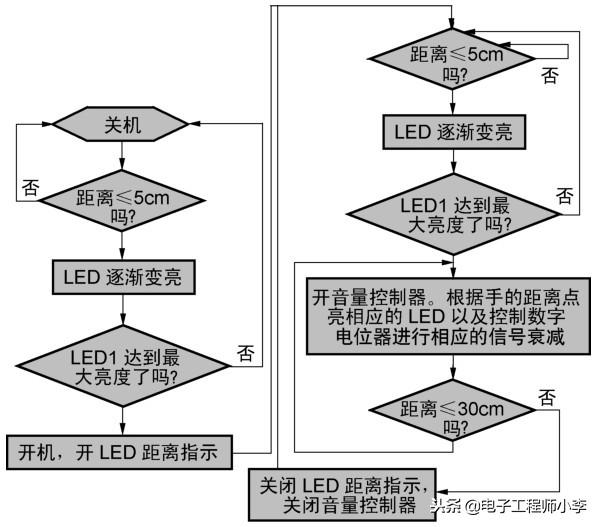 在本程序中,我采用下限距离法和LED渐亮指示法。先设定一个下限距离,比如5cm。当探测的距离大于或等于5cm时,不进行任何动作;当探测的距离小于5cm时,第一个LED由灭渐渐变亮,此过程大约持续2s,如果在这2s内,探测的距离一直小于5cm,那么就打开电源或音量控制开关(流程图见图2.8)。