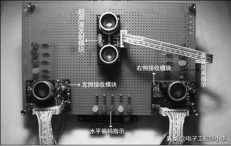 虽然材料没有多用很多,但是整个系统的布局相比于第一版有了很大的变化。一是为了适应二维控制的特殊性,二来也大大提高了抗干扰能力,并降低了功率放大器的噪声。具体设计如下:首先,我使用了两片比较大(大概是10cm×15cm)的万用板,顶板用来安装指示灯电路和超声波发射、接收模块,底板则包含了整个系统的核心电路,包括数字音量控制电路、电源控制电路、功率放大模块以及微控制器模块(见图2.20)。顶板与底板的连接是这样的,发射模块及接收模块使用自带的排线连接,而考虑到LED指示电路需要的连线比较多,就直接用长一点的单排针来连接了(见图2.21)。