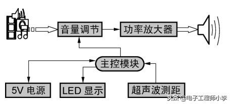 你一定想知道它是怎么工作的,原理其实很简单,就是使用传感器来测量手与机器的距离,根据不同的距离来控制音响,整个系统的构成如图2.1所示。当然这是一维探测,如果有两个传感器水平放置,通过计算两个传感器与手的距离差就可以进行二维控制。