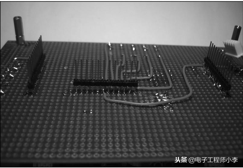 另外,还需要提醒两点:一是在线路排布上,由于涉及的元器件比较多,连线难免会搭在一起(见图2.22),一定要注意绝缘。我就遇到过下面这样的问题:在组装电源控制电路时,考虑到电路很简单,只有一个三极管、一个电阻、一个继电器,因此就直接用元器件引脚多出来的部分来连接,但我当时没有注意到,在焊接时引脚会很热,结果恰好熔化了旁边的红色塑料绝缘导线,从而造成了三极管基极和VDD之间短路。这个短路确实很“坑爹”,因为引脚导线很细,而且其温度又不至于使塑料绝缘体冒烟,结果两秒钟可以解决的问题,我花了好几个小时才解决。看来搞硬件的个个都要粗中有细才行。