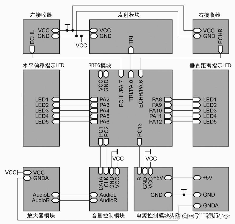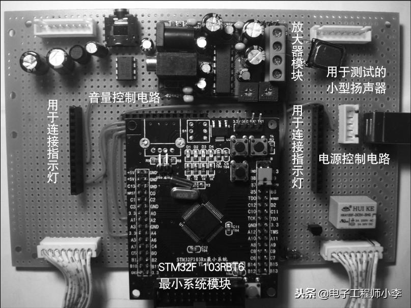 功率放大模块可以自制,也可以购买现成的,不过最好买单电源供电的,这样电平匹配会简单点。最小系统板选用雁凌YL-8。各个模块的硬件连接方法如图2.15所示。