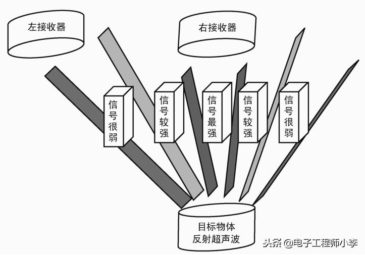 我研究了将近一个星期,还是没搞定,眼看计划就要泡汤了,最后终于想到了另一个方法——既然距离计算法不行,那就用信号强度检测法。这个方法非常接近蝙蝠的定位原理,因为蝙蝠的大脑没有那么快的处理速度,不可能计算出物体的距离。这个方法的原理非常简单:首先,发射器发射出一束超声波,请注意,这束超声波在同一水平面内,越接近中轴线的位置,信号强度越大。遇到手后反射的声波也同样如此(见图2.25)。如果手向左侧水平移动,左侧接收器接到的信号强度就会更强。根据两传感器的强度差即可知道偏移量。