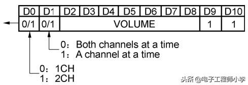 要控制 FM62429,我们需要两根线:数据线(DATA)和时钟线(CLOCK)。其时序如图2.12所示。数据位有10位,如图2.13所示,其中D0和D1位为声道选择位。当D1为0时,双通道同时修改。当D1为1时,若D0为0,只修改通道1;若D0为1,只修改通道2。D2~D10为音量控制位,因为音量衰减与数据值递增无关,因此只能查阅其数据手册来获得数据与音量的关系。