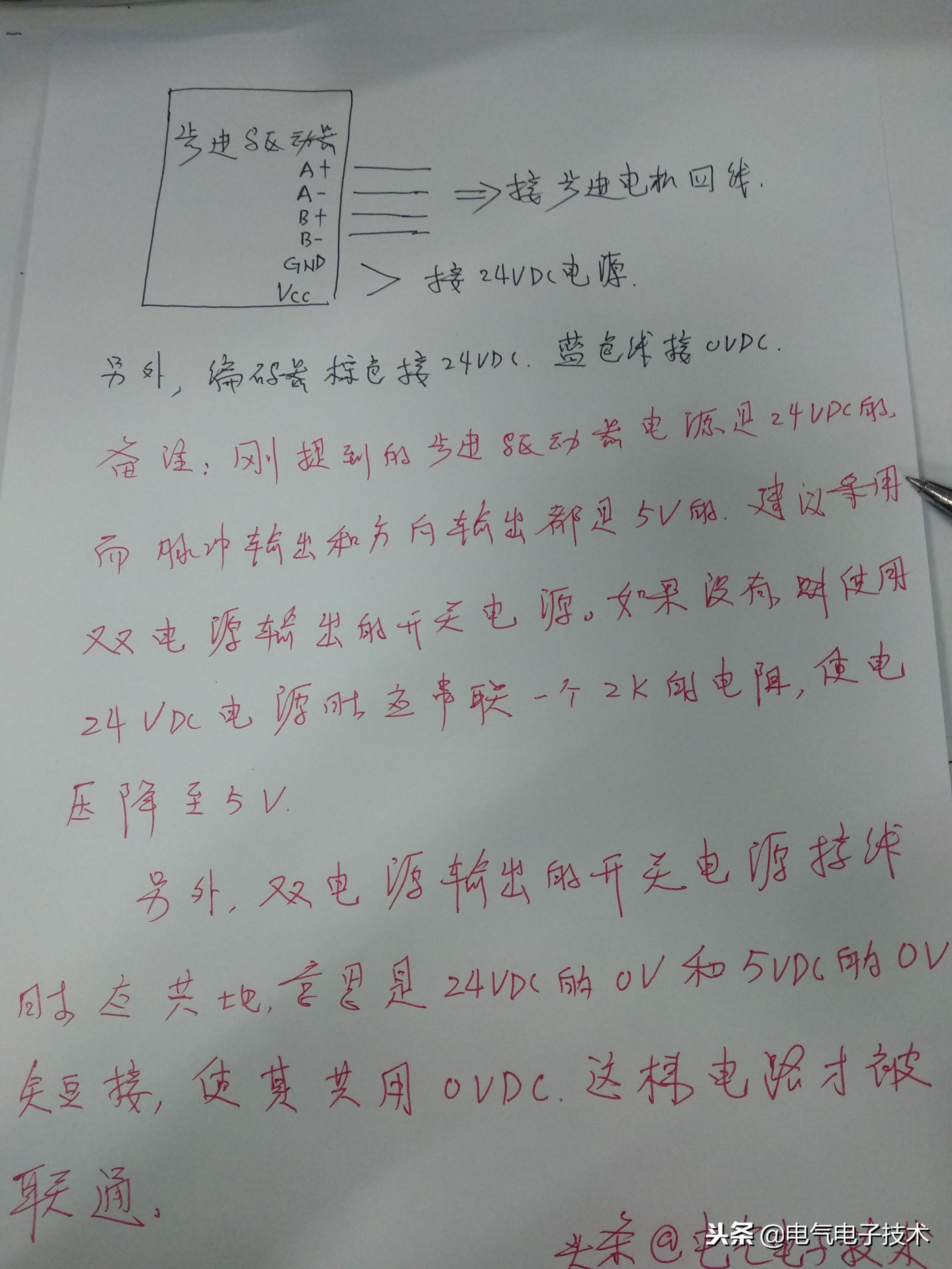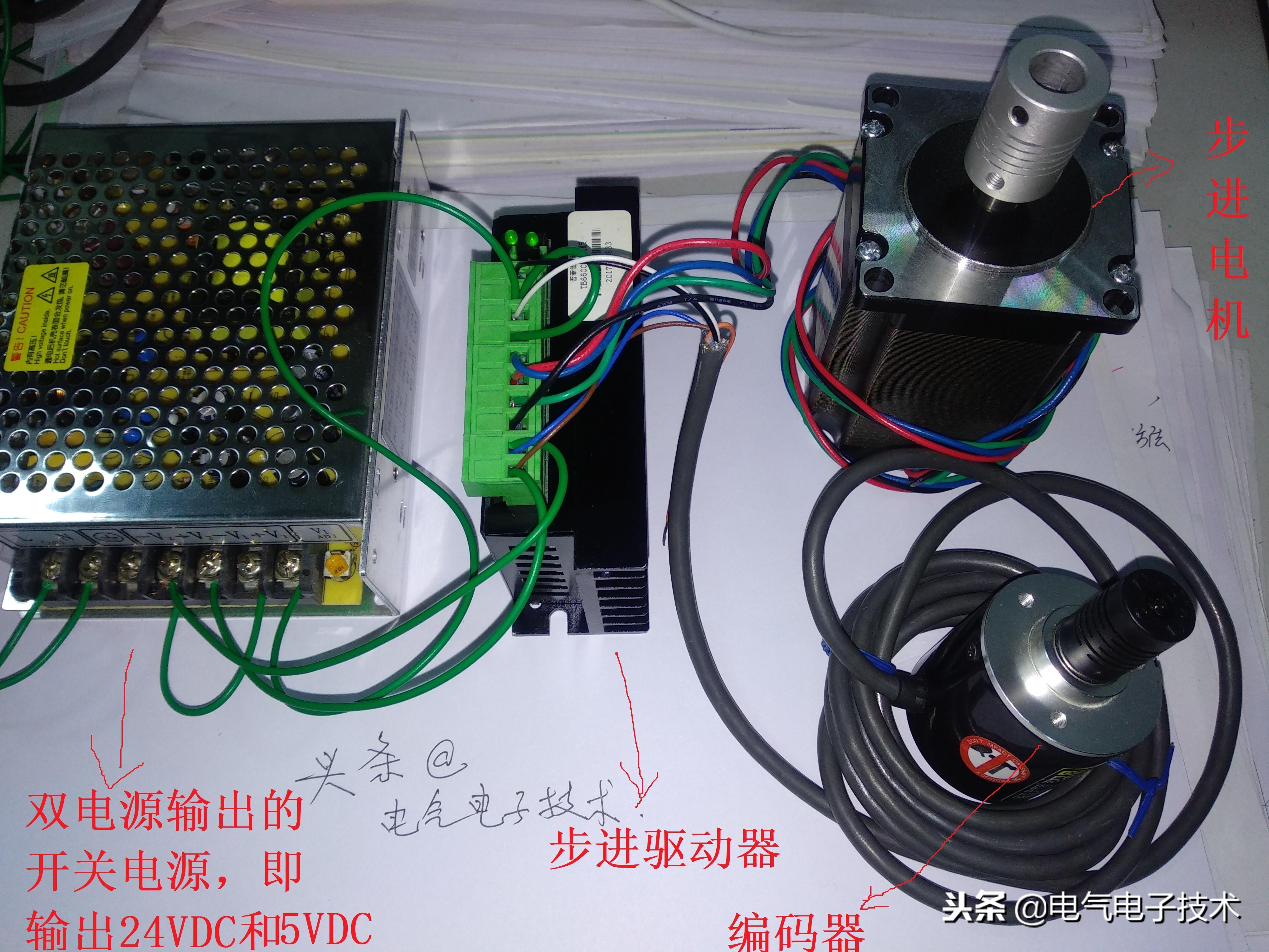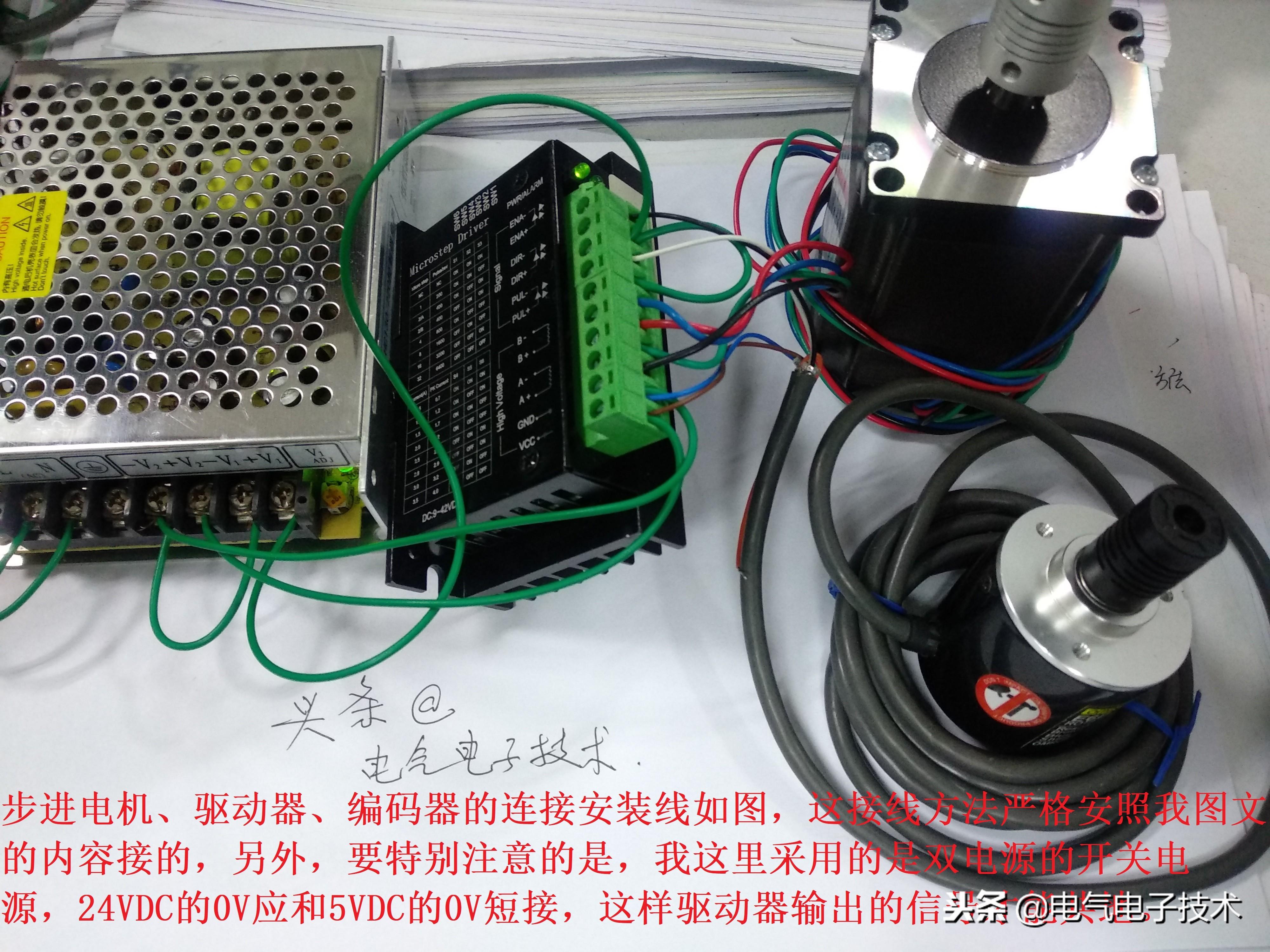 这接线方法严格安照我图文的内容接的,另外,要特别注意的是,我这里采用的是双电源的开关电源,24VDC的0V应和5VDC的0V短接,这样驱动器输出的信号才能共地。具体接线见下图,为了拍摄清淅些,我侧方了步进驱动器,方便大家实验: