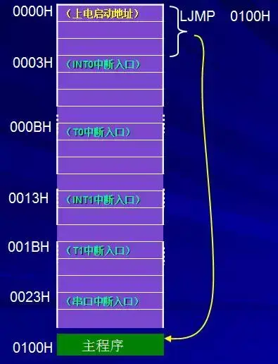 0000H单元:复位时程序计数器PC所指向的单元,因此用来 存放程序中的第一条指令;