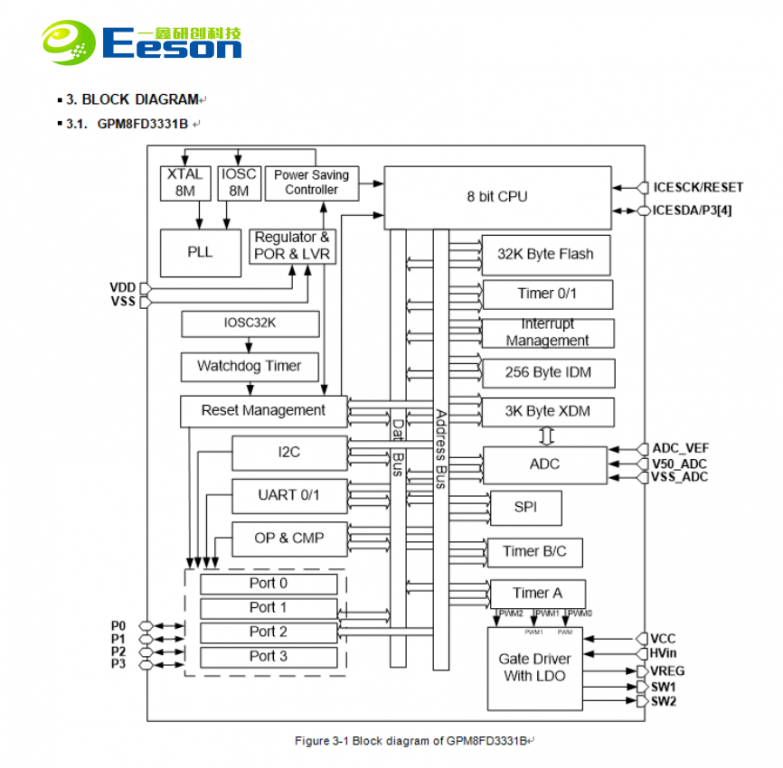 从上面的芯片BLOCK DIAGRAM可以看出GPM8FD3331B 主频65.38MHZ,ROM 32K,RAM 256Byte+3K,内置高精度晶振、LDO、Gate Driver、解码OP,属于高集成度的无线充电专用芯片。
