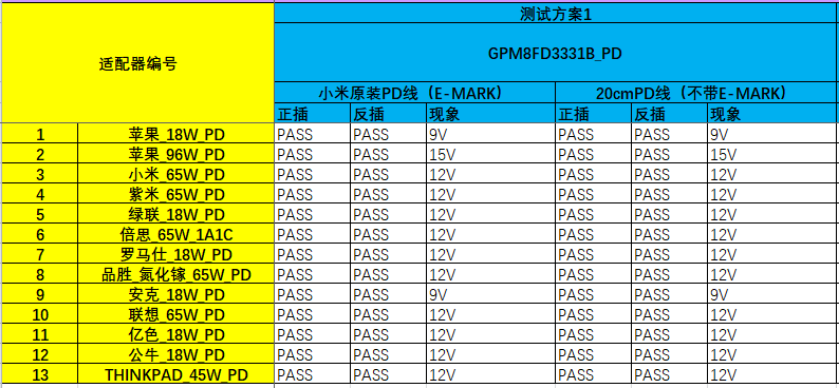 2、标准Type-C PD协议适配器输入,GPM8FD3331B内置PD协议,兼容市面上常规的PD适配器,默认从适配器获得12V输入。兼容性测试展示如下: