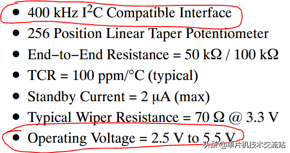 第一步我们当然要读CAT5140的数据手册,对于IIC通讯的器件,我们重点关注如下信息:首先,自然是要看器件支持的通讯速度以及VCC电压范围,如图(1)我们就可以知道CAT5140最大支持400KHz的通讯速率,供电范围在2.5-5.5V。