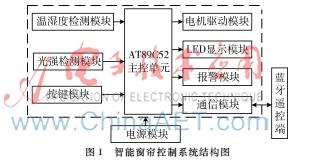 智能窗帘控制系统以AT89C52单片机为主控制芯片,硬件由电源模块、按键采集模块、温湿度采集模块、光强采集模块、AT89C52主控模块、LED显示模块、电机驱动模块、报警模块和通信模块组成。系统结构如图1所示。