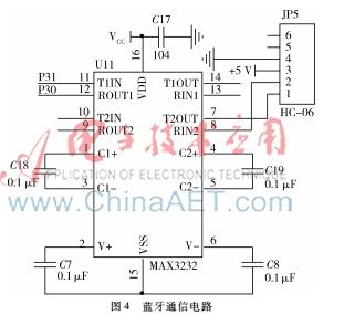 蓝牙通信电路由HC06蓝牙模块、MAX3232芯片及其辅助电路组成。MAX3232是电平转换芯片,用于单片机和蓝牙模块之间的电平匹配。单片机的P3.0和P3.1引脚与MAX3232电平转换芯片11和12引脚相连,利用单片机的内置串口接收HC-06发送的控制命令。蓝牙通信电路如图4所示。
