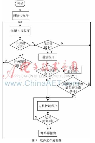 (2)首先调用通信程序,接收遥控端命令并进行处理,若接收命令为控制命令,则调用电机控制程序,控制电机动作。若为参数设置命令,则对接收参数保存,保存完成后,调用传感器检测程序,采集当前环境参数,并根据采集结果判断是否满足开关窗条件。若不满足则返回到步骤(1)。若满足开关窗条件调用电机控制程序,控制电机动作,执行步骤(3)。