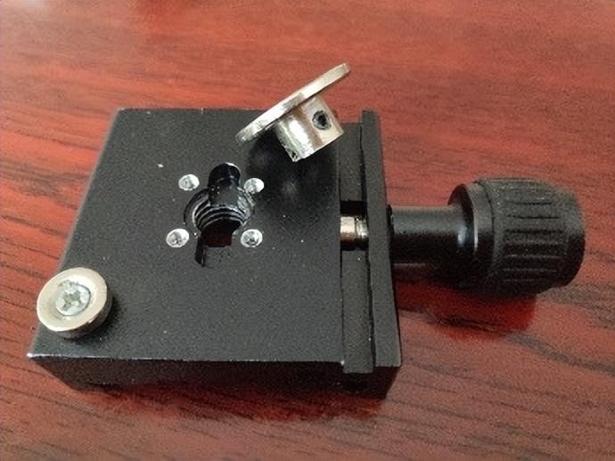 先将约3mm厚的铜片用螺丝固定在底板的反面,在底板的中心点打一个4mm的孔,用1/4-20UNC丝锥攻好1/4的螺孔,以便与快装板连接。