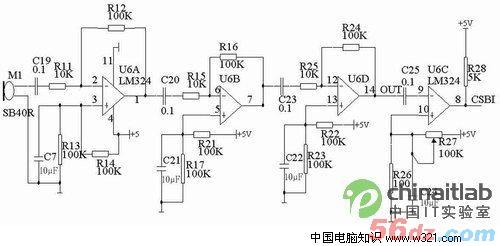 超声波接收器包括超声波接收探头、信号放大电路及波形变换电路三部分。超声波探头必须采用与发射探头对应的型号,关键是频率要一致,本设计采用 CSB40R,否则将因无法产生共振而影响接收效果,甚至无法接收。由于经探头变换后的正弦波电信号非常弱,因此必须经放大电路放大。正弦波信号不能直接被单片机接收,必须进行波形变换。按照上面所讨论的原理,单片机需要的只是第一个回波的时刻。接收电路的设计可采用专用接收电路,也可采用通用电路来实现,如图3所示。