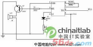 语音报警是指当倒车雷达探测到的距离小于所设定的安全值时,发出声音提醒驾驶员,语音电路设计如图4所示。M3720是单声一闪灯报警音效集成电路,芯片内存储一种报警音效,可直接驱动蜂鸣器发声或经外接功放三极管推动扬声器放音,同时还能驱动一只LED闪烁。该芯片各引脚功能为:5脚VDD; 1脚VSS分别为电源输入端与负端,VDD电压3~3.5V;8脚X和1脚Y分别为芯片外接振荡电阻器;6脚TG为触发控制端,低电平触发有效;3脚BZ 和2脚BB分别为报警音效输出端,可直接外接压电陶瓷蜂鸣器,如果驱动扬声器则由3脚BZ端引出;4脚L为闪灯输出端,可直接驱动LED发光。
