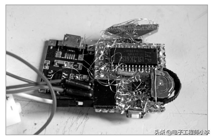 下面就是用同样的方法处理DS1302,也就不多说了。我使用了一条铁丝架在拨轮开关上加强固定,再顺便焊上锂电充电板。因为该电路的功耗很低,所以不需要使用很粗的漆包线,用最细的来连接电路完全不成问题,充电板直接和锂电池连接就好,如图16.15所示。