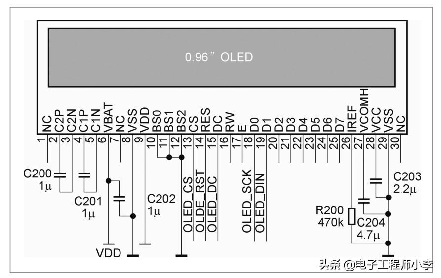 事实上,这个OLED困扰了我大半个小时,一直没有显示,检查连接也似乎没什么问题,也没有虚焊,后来仔细看了Datasheet才发现我犯了一个十分低级的错误,OLED的VCC并非逻辑电源输入,而是屏幕驱动电压输入,应该接上12V外部电源,在使用内部电荷泵升压的时候应该在外部对底连接一个电容。解决问题后,显示正常了(见图16.14)。