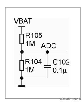供电方面采用了一片ME6219 LDO(低压差线性稳压器),见图16.5,它的压降仅为0.2V,可以满足锂电池供电的需要,像一般常用的AMS1117,它的压降达到了1V,也就是当锂电池电压为3.7V时,AMS1117最多只能输出2.7V的电压,完全起不到稳压的作用。同时,锂电池要考虑的问题就是电量检测,一方面提醒使用者充电,另一方面也要保护锂电池,电量过低就强制关机,以免过放对锂电池造成损伤。单片机的供电电压是3.3V,而电池的电压则是3.5~4.2V,是高于单片机电源电压的,因此就必须设计一个分压电路,分压之后再接入单片机的ADC进行测量。分压电路是始终连接在电池上的,如果电池电量全消耗在这个分压上,那也太冤枉了。所以我选择了两个1MΩ的电阻来分压(见图16.6),也就是2MΩ的阻值,根据欧姆定律可知,在3.7V标准电压下的电流仅为2μA,符合要求。但是这样又会出现一个问题,ADC也不是理想电表,存在一个输入阻抗的问题,我没有研究过STC的输入阻抗,但是明显不可能会远高于1MΩ,这样就必须加一个电容来减少输入阻抗过低对分压的影响。