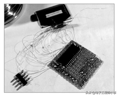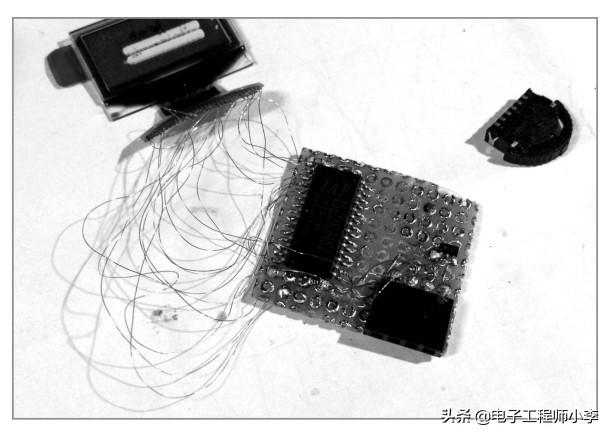 然后,处理和MCU连接最多的屏幕部分。虽然采用了四线制SPI通信,但是这个OLED内部电荷泵需要几个外部的电容,相对还是比较麻烦的。屏幕的引脚间距仅为0.8mm,比较考验“焊功”(见图16.10)。建议漆包线在焊接之前先镀好锡,会方便很多。屏幕部分完成之后,看起来就是一团糟的样子(见图16.11)。