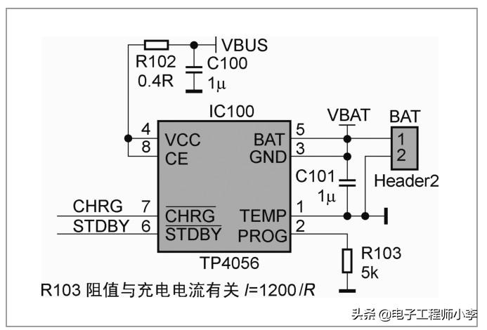 充电使用了常见的TP4056作为充电管理IC (见图16.7),TP4056是一款完整的单节锂离子电池恒流/恒压线性充电器,其底部带有散热片的SOP8封装与较少的外部元件数目,这使得TP4056成为便携式应用的理想选择。TP4056适用于USB电源和适配器电源,其输入电压范围为4~8V,充电电流最大1000mA。它的充电电流是通过一个外部电阻来调节的。其实TP4056的外部电路设计还是挺简单的,但是我还是单独使用了一块现成的充电板,因为主洞洞板上放不下了,最终也导致整个作品非常厚,也算是一点遗憾吧。