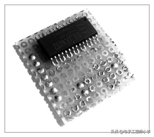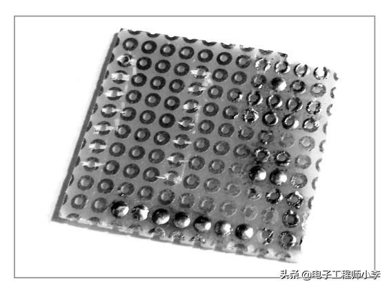 首先,把洞洞板裁成需要的大小,然后在上面合适的位置用美工刀割出SOP28的焊盘(见图16.8),因为SOP28的引脚间距为1.27mm,而洞洞板的洞间距为2.54mm,因此把每个洞的焊盘割成两半就可以焊接SOP28的芯片了。割的时候不一定要在正中间,但是一定要割干净,最好空出一条,避免短路之类的事情发生。