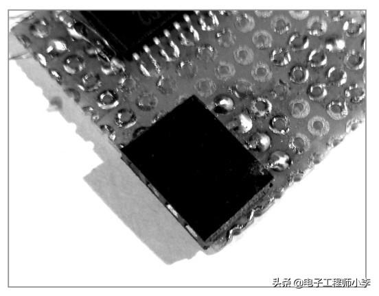 割完焊盘就可以焊接主MCU了,这个没有什么值得注意的,不要让引脚短路就可以了(见图16.9)。如果短路了,用把好点的烙铁,加点助焊剂(或者带助焊剂的焊锡也可以),烙铁可以把多余的焊锡吸起来,然后用海绵擦掉烙铁头上的锡就好了。