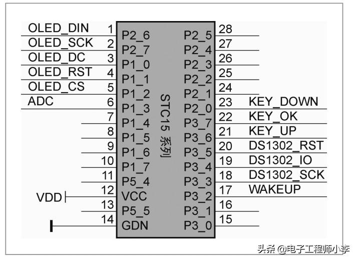 主控电路中最主要的部分就是STC15L2K60S2的单片机(见图16.2),我选择了SOP28封装的版本,比较小,制作手表比较合适。这是一款基于51内核的单片机,最高主频35MHz,具有60KB的ROM和2KB的RAM,虽然配置并不强大,但是做个手表还是绰绰有余的。型号中带L的为低电压版本,采用3.3V供电。其实这个系列的单片机应该是前几年初学者非常常用的,我当时学习的也是STC单片机。不过近几年随着国外开源硬件的发展,Arduino系的东西大有取代原来STC单片机国内DIY初学者入门必备地位的势头啊。当然相比Arduino,STC也是有它的优势的:第一就是便宜,一片STC只要5~8元就可以购得;第二是它的电路十分简单,最新的STC15系列,一片芯片就可以组成最小系统,和Arduino Mini一样,装上面包板直接可以用,不必连接外部复位或者晶体振荡器之类的东西;第三就是它的内部高精准RC振荡器可以调节频率,可以等我们把程序写完了再来调节频率,找到功耗和性能的平衡点;第四,它的社区支持并不差,Arduino有许多现成的程序可以利用,STC也一样,在国内有很多讨论51单片机的论坛,里面的程序都可以借鉴。因为数据量不大,手表对刷新率也没有很高的要求,我这个设计没有用到硬件的SPI,通过I/O口模拟SPI与OLED和DS1302通信。