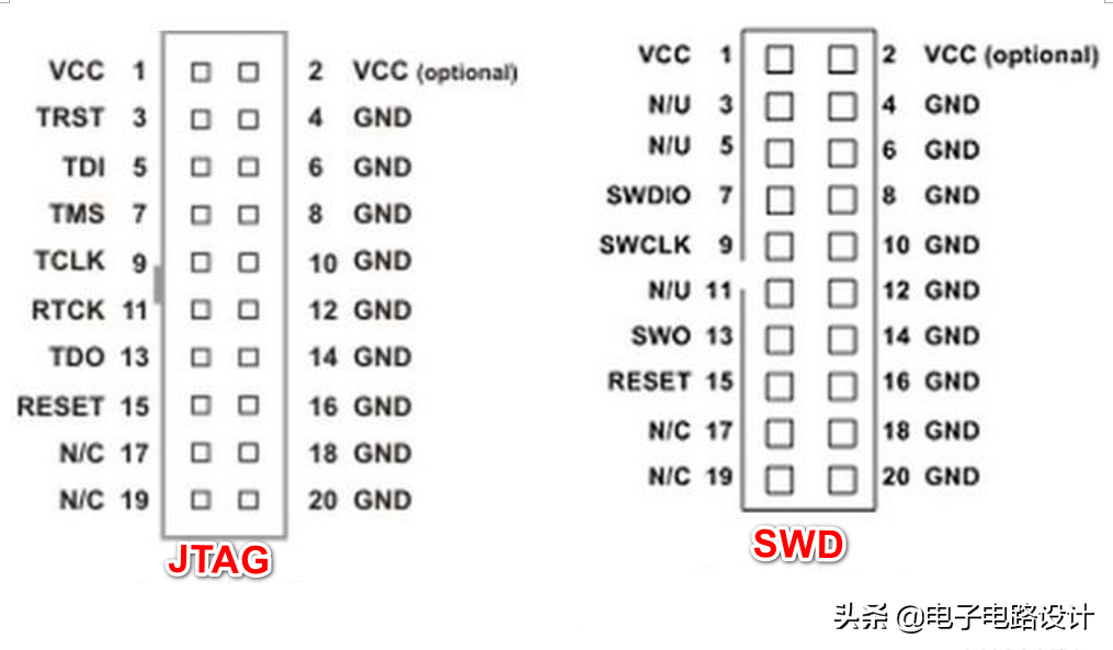 串行调试(Serial Wire Debug),应该可以算是一种和JTAG不同的调试模式,使用的调试协议也应该不一样,所以最直接的体现在调试接口上,与JTAG的20个引脚相比,SWD只需要4个(或者5个)引脚,结构简单,但是使用范围没有JTAG广泛,主流调试器上也是后来才加的SWD调试模式。