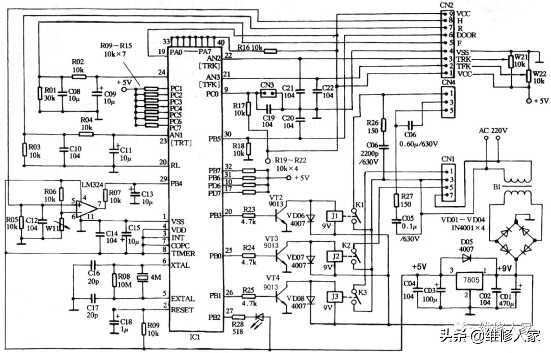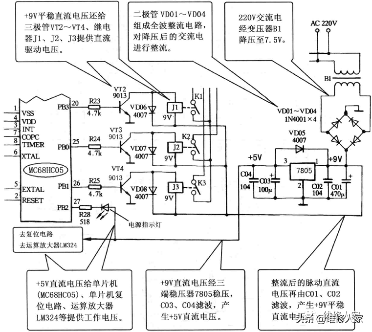 这是华菱BCD-320W型间冷式电冰箱的电气系统,该系统由单片机控制电路构成。单片机型号为MC68HC05,整个控制电路由电源电路、温度检测电路和运行控制电路组成。