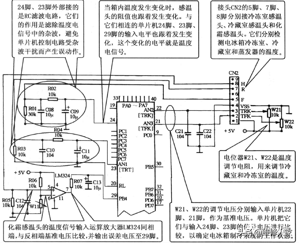 电冰箱冷冻室和冷藏室的温度范围分别由电位器W21、W22设定。冷冻室的“弱”、“中”、“强”三挡,分别对应的温度范围是-20〜-18°C、-22〜-20°C、-22〜-24°C。冷藏室的 “弱”、"中”、"强”三挡,分别对应的温度范围是7〜9°C、5〜7°C、3〜5°C单片机以此作为判断条件,对冷冻室和冷藏室感温头热输入的温度信号进行判断,并输出相应的控制电平。