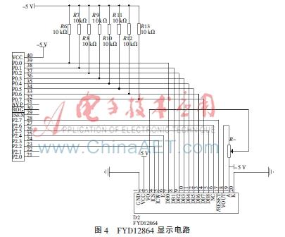 本设计中所采用的FYD12864液晶显示模块是128×64点阵型液晶显示模块,可显示各种字符及图形,具有8位标准数据总线、6条控制线及电源线。为了能够实现对该模块的控制,采用P0和P2口控制,由于51单片机P0口没有内部上拉电阻,为此需要外部增加上拉电阻,本设计增加的外部上拉电阻为10 kΩ;对于FYD12864液晶显示模块来说,第三引脚VO是对比度电位引脚,本设计中采用10 kΩ的可变电阻来实现对比电压的调整,如图4所示。