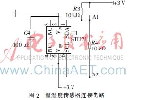 温湿度传感器SHT21的管脚定义如表1所示,该传感器的供电范围为2.1~3.6 V,推荐电压为3.0 V,为了保证传感器的正常运行,在电源(VDD)和接地(VSS)之间须连接一个0.1 μF的电容,且电容的位置应尽可能靠近传感器。SCL用于微处理器与传感器之间的通信同步,SDA引脚用于传感器的数据输入和输出,当向传感器发送命令时,SDA在串行时钟(SCL)的上升沿有效,在SCL下降沿之后,SDA值可被改变;当从传感器读取数据时,SDA在SCL变低以后有效,且维持到下一个SCL的下降沿。为避免信号冲突,通常在SDA端口需要一个外部的上拉电阻(如10 kΩ)将信号提拉至高电平。